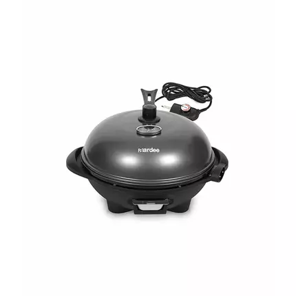 Features: Electric barbeque with cool-touch handle for easy handling Diameter of cooking plate: 40cm Die cast aluminum grill plate with ceramic non-stick coating surface With thermostat and pilot light Built-in thermometer Power cord length: 2.9m 2/3 ribbed grill surface, 1/3 grill flat for versatile cooking Removable high-domed lid with hook Lid can be used as a wind shield With tray to hold cooking and serving accessories Drain grease with built-in drip tray for low-fat cooking and easy cleaning Table grill function when used without stand Ceramic coating Easy portability Built-in timer