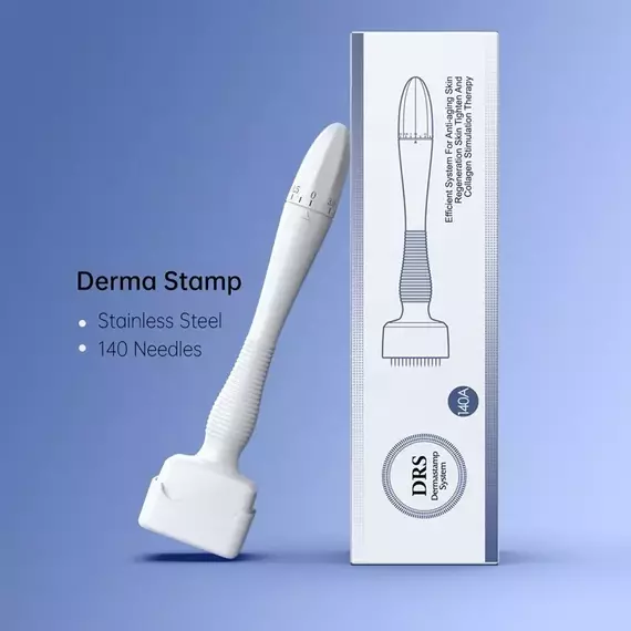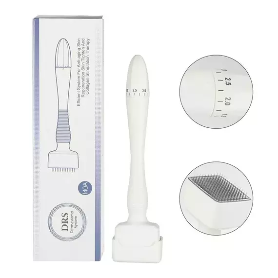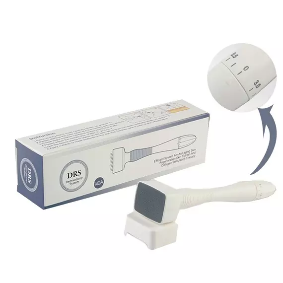 The image shows a DRS 140A Adjustable Derma Stamp, a microneedling device used for skin and hair care. Here's helpful information about it: