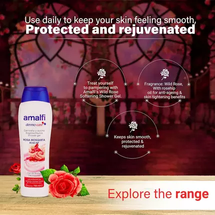 Treat yourself to pampering with Amalfi’s Wild Rose Softening Shower Gel! This shower essential contains rosehip oil, known for its anti-ageing and skin tightening benefits. Use daily to keep your skin feeling smooth, protected and rejuvenated. Contains Rosehip Oil to soften skin and leave it feeling smooth and rejuvenated. Made with certified rosehip oil. No sulfates, no parabens, no phthalates.