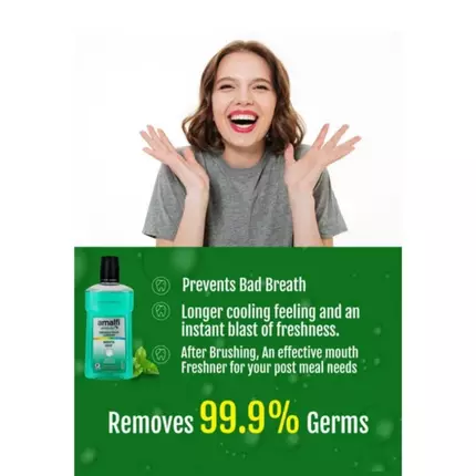 Amalfi Mint Mouthwash kills 99 percent of germs that cause bad breath and cavities, leaving your mouth feeling fresher and cleaner than brushing alone. It can make your gums up to 64% healthier. Over 99 percent of bacteria that cause bad breath and cavities are destroyed. This mouthwash contains no alcohol (non-alcoholic) hence does not cause any burning sensation when you use it. Despite this, it instantly kills 99 percent of bacteria. You'll get a 10X longer cooling feeling and an instant blast of freshness.