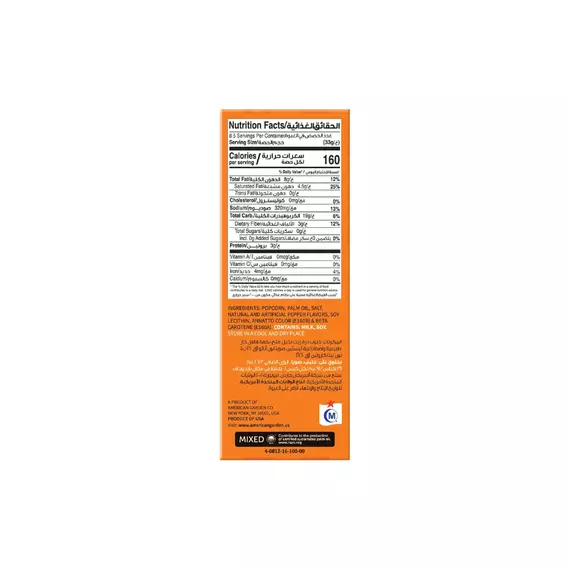 American Garden Microwave Hot N Spicy Popcorn 273g combines our authentic popcorn flavor using top-quality kernels with a little extra spicy kick. Contains zero trans fats or cholesterol, and no artificial colors or preservatives, making this bag of spicy goodness a guilt-free everyday treat. Feel the heat with this 3-minute ready treat; the perfect match for a movie night, game night, BBQ, or party. American Garden brings you premium quality foods from the United States and around the world. Our wide range of authentic foods is perfect for sharing with friends and family.