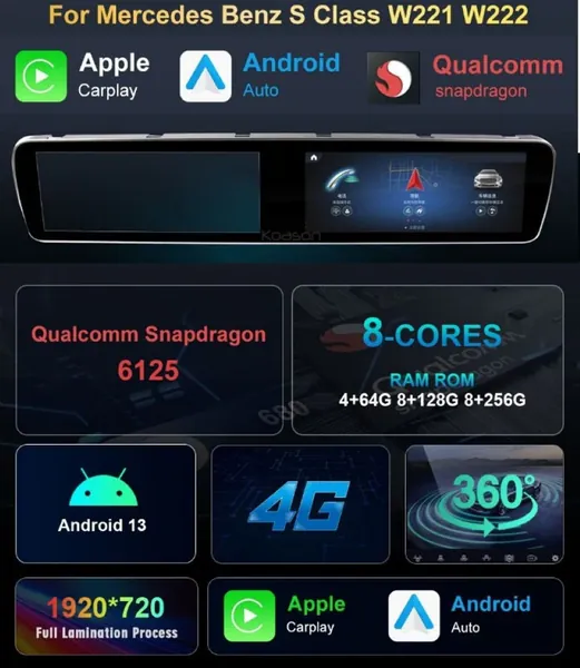 COMPATIBLE WITH MERCEDES S CLASS W221 2010-2013 ANDROID INSTRUMENTAL CLUSTER SPEED O MEETER MULTIMEDIA INFOTAINMENT TOUCHSCREEN DVD PLAYER WIRELESS CARPLAY ANDROID AUTO 4GB +64GB 19 INCH 3.5