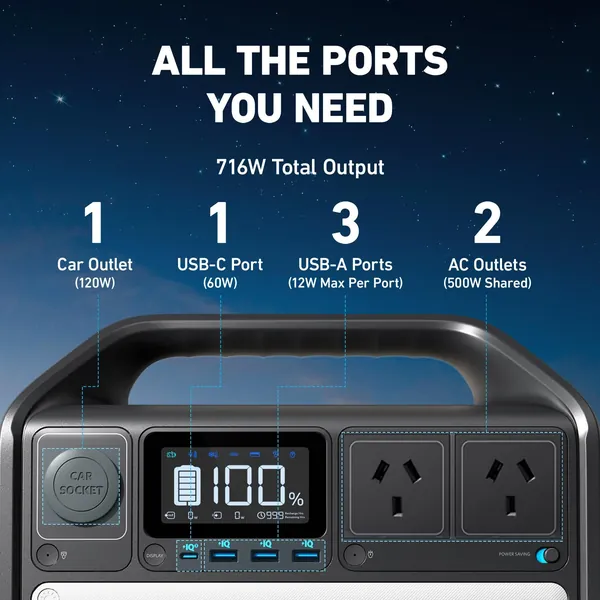 The power station has all the ports you need to charge your devices and appliances. It is equipped with 2AC ports, 3 USB-A ports, a USB-C port, and a car outlet.