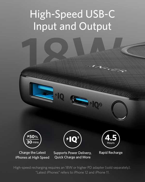 USB-C Port: Accepts up to 18W input for recharging the power bank efficiently.
