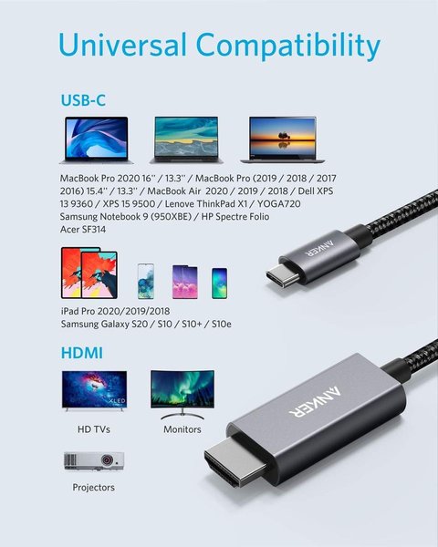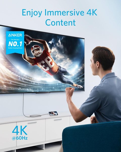 Experience seamless 4K Ultra HD streaming with the Anker USB-C to HDMI Cable (A8730H11)-a 1.8m premium nylon-braided cable designed for flawless high-resolution video output. With total compatibility for USB-C and Thunderbolt 3 devices, it effortlessly connects your laptop, MacBook, tablet, or phone to any HDMI-enabled display, monitor, or TV. Delivering 4K resolution at 60Hz, this plug-and-play HDMI adapter ensures ultra-smooth video performance for presentations, gaming, multi-monitor setups, and home entertainment. No drivers or software required-simply connect and start streaming in seconds. Built for long-lasting durability, the double-braided nylon exterior and rustproof aluminum alloy connectors withstand 10,000+ plug-ins and bends, ensuring superior reliability and longevity. Whether you're expanding your workstation or enhancing your entertainment experience, the Anker USB-C to HDMI Cable is your perfect high-performance connection solution.