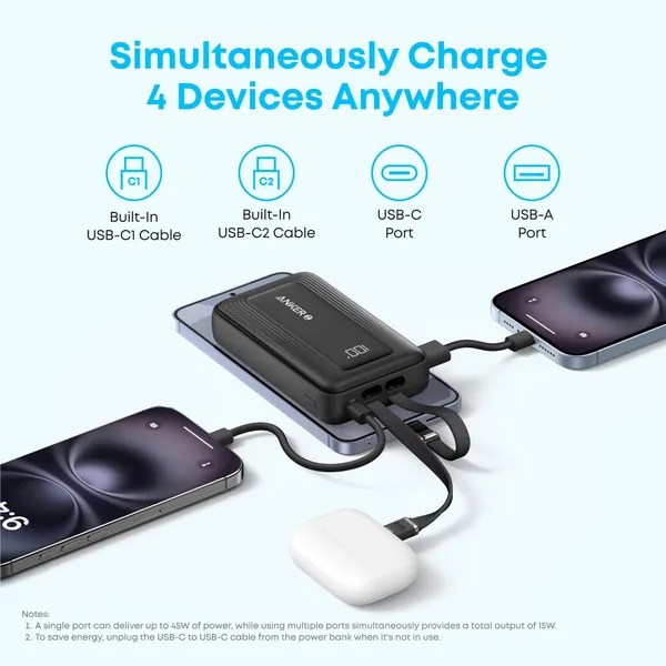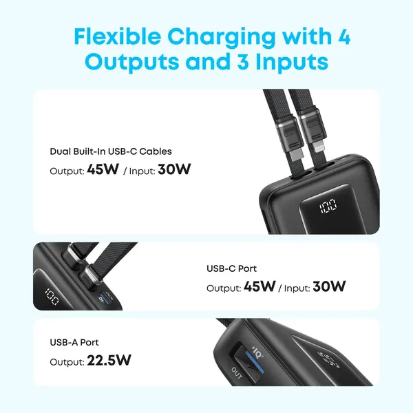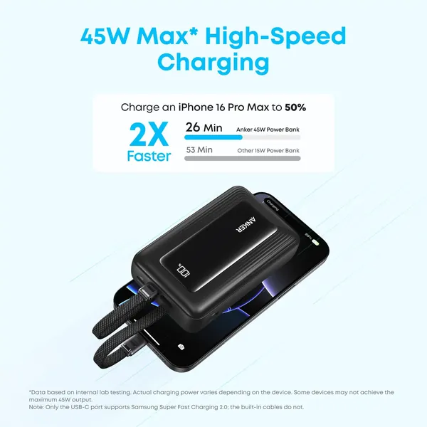 With 45W high-speed charging, you can boost an iPhone 16 to 57% or a Samsung S24 to 55% in just 30 minutes.