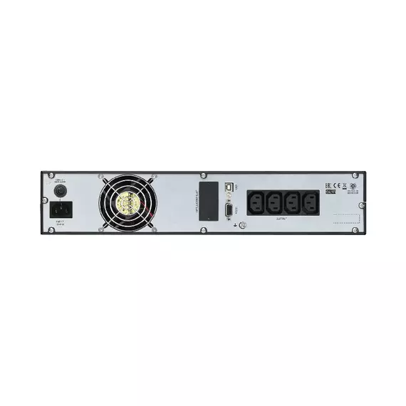 1 Battery type: Lead-acid battery Battery voltage: 48 V Battery recharge time: 4 h Battery charger power: 70 W rated Max runtime: 4 min Colour: Black Height: 8.6 cm Width: 43.7 cm Depth: 46.2 cm Net weight: 18.2 kg Mounting location: Front Mounting preference: Lower Mounting mode: Rack-mounted with kit USB compatible: Yes Mounting position: Horizontal Maximum configurable power in VA: 2000 VA Maximum configurable power in W: 1600 W Output frequency: 50/60 Hz +/- 3 Hz sync to mains Harmonic distortion: 3 % Wave type: Sine wave Efficiency: 88 % (full load) Additional information: Configurable for 220 : 230 or 240 nominal output voltage Bypass type: Internal bypass (automatic and manual) Crest factor: 3 : 1 Product certifications: CE, EAC, TISI Standards: EN/IEC 62040-1:2019/A11:2021, EN/IEC 62040-2:2006/AC:2006, EN/IEC 62040-2:2018 Ambient air temperature for operation: 0…40 °C Relative humidity: 0…95 % non-condensing Operating altitude: 0...3000 m Ambient air temperature for storage: -20…50 °C Storage Relative Humidity: 0…95 % non-condensing Storage altitude: 0…15000 m Acoustic level: 50 dBA Heat dissipation: 745 Btu/h IP degree of protection: IP20 Alarm: Alarm when on battery : distinctive low battery alarm : overload continuous tone alarm Free slots: 1 Control panel: Multifunction LCD status and control console Surge energy rate: 600 J Unit Type of Package 1: PCE Number of Units in Package 1: 1 Package 1 Height: 21.8 cm Package 1 Width: 70 cm Package 1 Length: 55 cm Package 1 Weight: 20.7 kg