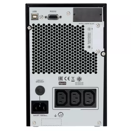 High quality, Double-conversion On-line UPS designed for essential power protection needs even in the most unstable power conditions. Includes: (1) DC cable, Basic UPS signalling RS-232 cable, CD with software, Country-specific detachable power cord, USB cable, User manual Key Features Output power capacity: 800 Watts / 1.0kVA Output Connections: (3) IEC 60320 C13 (Battery Backup) Nominal Output Voltage: 230V Nominal Input Voltage: 230V Input Connections: IEC 60320 C14 Cord Length: 1.5meters Technical Specifications Output Max Configurable Power (Watts): 800 Watts / 1.0kVA Output Voltage Note: Configurable for 220 : 230 or 240 nominal output voltage Efficiency at Full Load: 88.0 % Output Voltage Distortion: 3 % Output Frequency (sync to mains): 50/60 Hz +/- 3 Hz Sync to mains Other Output Voltages: 220 V, 240 V Load Crest Factor: 3 : 1 Topology: Double conversion online Waveform type: Sine wave Bypass: Internal bypass (automatic and manual) Input Input frequency: 40 - 70 Hz Auto sensing Input voltage range for main operations: 110 - 285 Half load, 160 - 280 Full loadV Number of Power Cords: 1 Efficiency at Full Load: 88.0 % Other Input Voltages: 220 V, 240 V Batteries & Runtime Battery type: Lead-acid battery Typical recharge time: 4.5hour(s) Nominal Battery Voltage: 36 V Expected Battery Life (years): 3 - 5 Battery Charge Power (Watts): 175 Watts