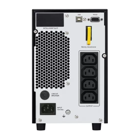 Technical Specifications Output Max Configurable Power (Watts): 1.6kWatts / 2.0kVA Output Voltage Note: Configurable for 220 : 230 or 240 nominal output voltage Efficiency at Full Load: 88.0 % Output Voltage Distortion: 3 % Output Frequency (sync to mains): 50/60 Hz +/- 3 Hz Sync to mains Other Output Voltages: 220 V, 240 V Load Crest Factor: 3 : 1 Topology: Double conversion online Waveform type: Sine wave Bypass: Internal bypass (automatic and manual) Input Input frequency: 40 - 70 Hz Auto sensing Input voltage range for main operations: 110 - 285 Half load, 160 - 280 Full load Number of Power Cords: 1 Efficiency at Full Load: 88.0 % Other Input Voltages: 220 V, 240 V Batteries & Runtime Battery type: Lead-acid battery Typical recharge time: 4hour(s) Nominal Battery Voltage: 48 V Expected Battery Life (years) : 3 - 5 Battery Charge Power (Watts) : 70 Watts Communications & Management Interface Port(s): DB-9 RS-232, USB Control panel: Multifunction LCD status and control console Audible Alarm: Alarm when on battery : distinctive low battery alarm : overload continuous tone alarm Surge Protection and Filtering Surge energy rating: 600Joules Physical Maximum Height: 9.37inches (238MM, 23.8CM) Maximum Width: 5.71inches (145MM, 14.5CM) Maximum Depth: 15.75inches (400MM, 40.0CM) Net Weight: 37.04lbs. (16.8KG) Color: Black