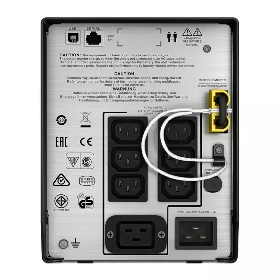 Intelligent and efficient network power protection from entry level to scalable runtime. Ideal UPS for servers, point-of-sale, routers, switches, hubs and other ... Includes: CD with software, Documentation CD, USB cable Technical Specifications Output Max Configurable Power (Watts): 1.3kWatts / 2.0kVA Output Voltage Distortion: Less than 5% at full load Output Frequency (sync to mains): 50 Hz Sync to mains Topology: Line interactive Waveform type: Sine wave Input Input frequency: 47 - 63 Hz Input voltage range for main operations: 170 - 300 Adjustable, 180 - 287V Other Input Voltages: 220 V, 240 V Batteries & Runtime Battery type: Lead-acid battery Typical recharge time: 3hour(s) Expected Battery Life (years): 3 - 5 RBC Quantity: 1 Battery Charge Power (Watts): 166 Watts