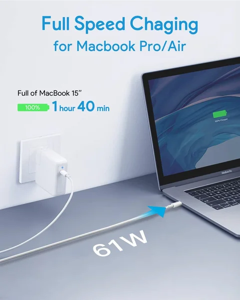 This high-performance 61W/67W USB-C power adapter is designed to deliver fast, efficient charging for a wide range of Apple MacBook models. It automatically identifies your device to provide the optimal power output for safe and rapid charging.