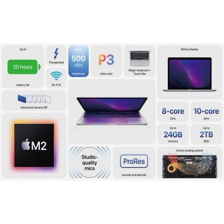 Apple’s most portable pro laptop is even more capable with the new M2 chip-and the same compact design. Power through demanding workflows all day long with up to 20 hours of battery life and an active cooling system to sustain enhanced performance.