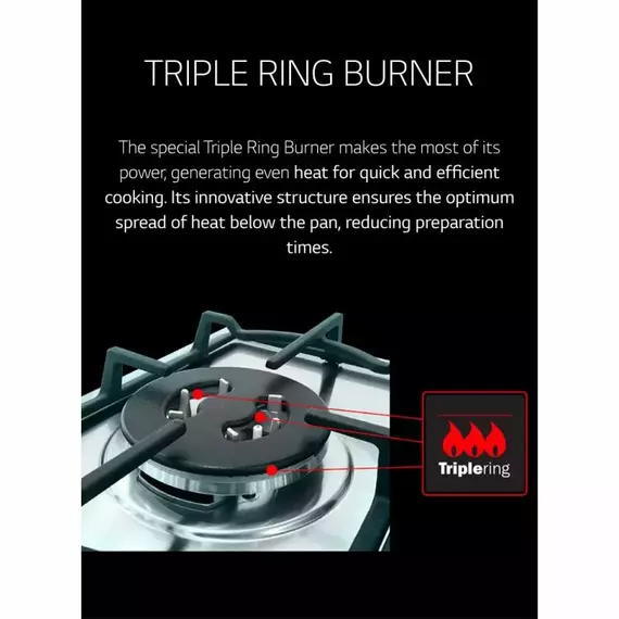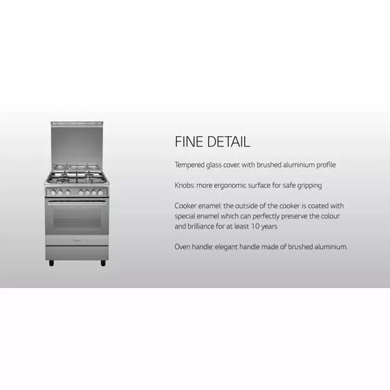 Specifications: 60 X 60cm Stainless Steel 4 Gas Burners Hob Ignition Gas Oven/grill Hob/oven/grill Flame Failure Device Shashlik Skewer Minute Minder Technical Details Safety Gas Cut Off 3 Normal Burners 1 Triple Ring Burner One Hand Ignition Tempered Glass Cover 59L Electric Oven Ventilated Oven Low Power Consumption Energy A Grill With Door Close Stainless Steel Finish