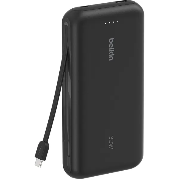 Plug in with the integrated USB-C cable and quickly charge on-the-go with up to 30W.