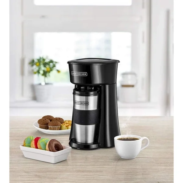 The Black & Decker DCT10-B5 Coffee Machine is a compact, user-friendly solution for brewing a single, fresh cup of coffee on the go. Its 650W power ensures quick brewing directly into the included 360ml travel mug, featuring a sleek black and silver design with practical safety features.
