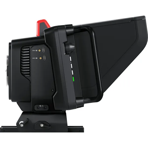 The distinctive Blackmagic Studio Camera has all the benefits of a large studio camera because it's a combination of camera and viewfinder all in a single compact design. It features a lightweight carbon fiber reinforced polycarbonate body with innovative technology in a miniaturized design. The camera is designed for live production, so it's easy to track and frame shots with its large 7" viewfinder. The touchscreen has menus for camera settings, and there are knobs for brightness, contrast, and focus peaking. Plus, a tripod mount and mounting plate are included for fast setup.