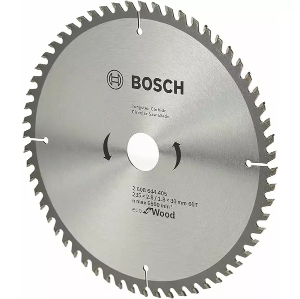 The Bosch Eco for Wood Circular Saw Blade (2608644405) is a premium 235mm blade designed for reliable, fine cuts in wood. Featuring 60 fully ground ATB teeth, it delivers smooth, effortless cutting performance and a long service life, backed by Bosch's stringent quality standards.