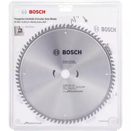 Eco for Aluminium Circular Saw Blade is the preferred choice for reliable cuts in aluminium Fully ground teeth provide smooth and effortless cutting Well-selected teeth ensure a good lifetime Bore works with or without reduction rings to fit different sizes Eco for Aluminium Circular Saw Blade is the preferred choice for reliable cuts in aluminium Well-selected teeth ensure a good lifetime Carefully controlled production process to meet the reliable quality standards of Bosch Specifications: Packaging type: Paper / Cardboard / Corrugated board - Packaging, folded carton, with Euro hole Pack quantity: 1 Pcs Outer diameter mm: 305 Bore size mm: 30 Bore with reduction ring mm: 25.4 Width of cut (b1) mm / Base bl. thickness (b2) mm: 3/2.2 Number of teeth: 80 Tooth shape: TCG Max. rotation speed (RPM): 5000 Cutting result: Fine Cut Hook angle ° 7 Relief angle: 13