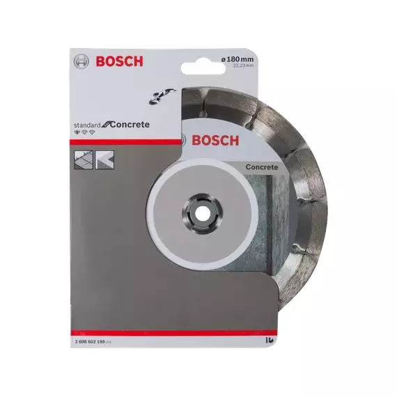 Standard for Concrete Diamond Cutting Disc provides reliable cuts in concrete Optimised diamond matrix delivers solid results thanks to the disc's high-quality standards Bosch´s diamond competence centre in Switzerland ensures consistent quality With 22.23 mm bore for standard locking nut angle grinders Standard for Concrete Diamond Cutting Disc provides reliable cuts in concrete Bosch´s diamond competence centre in Switzerland ensures consistent quality Features: Long service life: extremely durable cutting edge thanks to Bosch Diamond Technology, an advanced matrix of metal and diamonds that remains extremely sharp High working speed: the material is efficiently vacuumed through large dust slots. The rapid removal of dust from the work surface is crucial for speed High load capacity: extra high diamond segments last even longer than normal diamond discs. They are particularly suitable for cutting the toughest and most demanding materials Areas of application: the diamond cutting disc is ideal for cutting concrete and masonry Compatibility: suitable for all standard angle grinders Specifications: Packaging Type: Paper / Cardboard / Corrugated board - Packaging, pocket, with Euro hole Pack quantity: 1 Pcs Diameter mm: 180 Bore diameter mm: 22.23 Cutting width mm: 2.0 Segment height mm: 10 Product Dimensions: 21.5 x 18.7 x 0.3 cm; 345 g Item model number: 2608602199 Size: 180 mm Colour: Silver Style: Concrete Material: Diamond Item Package Quantity: 1 Number of Pieces: 1 Batteries included?: No Batteries Required?: No Item Weight: 345 g