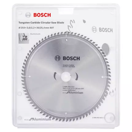 Bosch Eco Line Circular Saw Blade Aluminum 254mm 80 Teeth 2608644413 Eco for Aluminium Circular Saw Blade is the preferred choice for reliable cuts in aluminium Fully ground teeth provide smooth and effortless cutting Well-selected teeth ensure a good lifetime Bore works with or without reduction rings to fit different sizes. Specifications: Materials: Aluminium, Non-ferrous metals Outer diameter mm: 254 mm Number of teeth: 60 Width of cut (b1): 3 mm