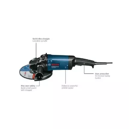 The Bosch GWS 2000 Professional Angle Grinder is a powerful and versatile tool that is perfect for a variety of applications. With a 2000 watt power input and a no load speed of 6500 rpm, this angle grinder is sure to get the job done quickly and efficiently. Additionally, the GWS 2000 features a M14 spindle size and a 7 inch wheel diameter, making it a versatile and versatile tool that can handle a variety of different projects. Features: Low cost of ownership Longer life time of critical parts Reduced tool breakdown time Easily available spare parts Specifications: Power Consumption: 2000 W Disc Diameter: 7 inch Model Name/Number: GWS 2000-180 Product Type: Angle grinder Warranty: 6 months Brand: Bosch No Load Speed: 6500 r.p.m. Usage/Application: grinding Color: Blue Weight: 5.3 kg Spindle Thread: M 14 Lock On-Off Switch: Yes Packaging Dimensions W x L x H: 270x73x100 mm Type of Power Source: corded electric