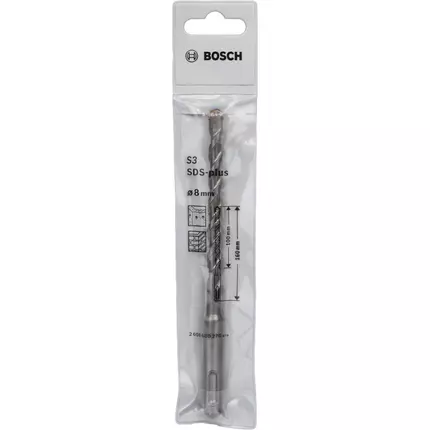 Bosch SDS-Plus Hammer Drill Bit 1x08X100X160 mm 2608680270 SDS plus-1 Drill Bit is optimized for drilling in concrete 2-cutter Tungsten Carbide plate makes the bit extra tough 2-flute U-shape flute design provides effective dust removal and standard lifetime Fits all SDS plus rotary hammer drills. Materials: Concrete, Lime and sand bricks, Solid brick, Concrete building block, Hard stone Diameter (D) mm: 8.00 Working length (L1) mm: 100 Total length (L2) mm: 160 Choose a pack size: 1 Pcs