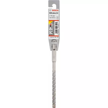 Bosch Sds-plus Hammer Drill Bit 5X08X100X160 mm 2608833789 SDS plus-5X Drill Bit offers highly efficient drilling in reinforced concrete Geometrical form of the 4-cutter head prevents jamming and breakage for optimal results “Turn-angle” head and 4-flute design provide fast dust removal for increased drilling speeds and reduced wear Fits all SDS plus rotary hammer drills. Materials: Reinforced concrete, Concrete, Lime and sand bricks, Solid brick, Hard stone Diameter (D) mm: 8 Working length (L1) mm: 100 Total length (L2) mm: 160 Choose a pack size: 1 Pcs