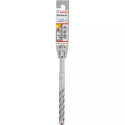 Bosch Sds-plus Hammer Drill Bit 5x12X100X160 mm 2608833807 SDS plus-5X Drill Bit offers highly efficient drilling in reinforced concrete Geometrical form of the 4-cutter head prevents jamming and breakage for optimal results “Turn-angle” head and 4-flute design provide fast dust removal for increased drilling speeds and reduced wear Fits all SDS plus rotary hammer drills. Materials: Reinforced concrete, Concrete, Lime and sand bricks, Solid brick, Hard stone Diameter (D) mm: 12 Working length (L1) mm: 100 Total length (L2) mm: 160 Choose a pack size: 1 Pcs
