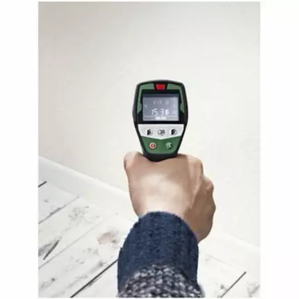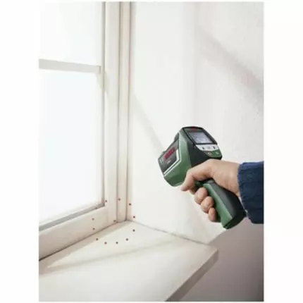 The next level in thermo detection – automatic analysis for energy savings and a healthier home Enjoy a safer home and energy savings in a flash – the PTD 1 thermo detector measures and automatically interprets surface and room temperatures as well as relative humidity levels to quickly locate thermal bridges and areas at high risk of mould. Results are displayed in an LED traffic light system with red, yellow, and green to indicate risk levels. Choose between three measuring modes for more precise results depending on the material and switch between individual or continuous modes for spot measurements or scanning objects. Measure temperatures of heaters and floor heating, or control isolation by detecting sources of energy loss on windows and doors. Create a healthier home environment by checking walls and bathrooms for high risk of mould. Features: Save energy and live healthier Measure surface and room temperatures as well as air humidity with ease Save energy by detecting thermal bridges and sources of energy loss quickly Create a safer home by spotting mould risks via automatic analysis and data interpretation Results displayed in LED traffic light system for risk level indication Select from 3 emission values for even more precise results Technical Data: Battery:2 x 1.5 V LR6 (AA) Weight:0.28 kg Working range, approx.:1 m Optics:10:01 Measurement range:Surface temperature Measurement range:–20 to +200 °C Measurement range:Ambient temperature Measurement range:–10 to +40 °C Measurement range:Relative humidity Measurement range: -20 to 90% Tool dimensions (L x W x H):34 x 19 x 79 mm