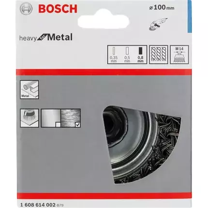 Metal Wire Cup Brush provides an extra-coarse surface finish Knotted wire for heavy-duty cleaning applications in metal Suitable for cleaning work on medium to large steel surfaces, such as removing heavy rust, underseal, paint or varnish Fits all M14 angle grinders Metal Wire Cup Brush provides an extra-coarse surface finish Suitable for cleaning work on medium to large steel surfaces, such as removing heavy rust, underseal, paint or varnish Available in different thicknesses. Thicker wires deliver a coarser yet faster finish; thinner wires for finer results Brush wires are available in different thicknesses for variable levels of abrasive needs. Thicker wires are more aggressive, producing a coarser yet faster surface finish, while thinner wires deliver finer, smoother surface results. It is intended for use with angle grinders with an M14 thread. Specifications: Packaging type: Paper / Cardboard / Corrugated board - Packaging, tube, with Euro hole Pack quantity: 1 Pcs Diameter mm: 100 Wire thickness mm: 0.8 Max. speed rpm: 8500 Thread M: 14 For angle grinders, min. diameter (mm): 180 Securing: Thread Material: Knotted wire Item Weight: 980 g Item model number: 1608614002 Size: 100mm x M14 Color: Blue Style: 1608614002 Power source type: Hand-operated Item Package Quantity: 1 Cutting Diameter: 100 Millimeters Included components: Bosch Cup Brush Steel Braided Wire 100 mm 0.8 mm 8500 rpm M 14 Batteries Included?: No Batteries Required?: No Item diameter: 100 Millimeters