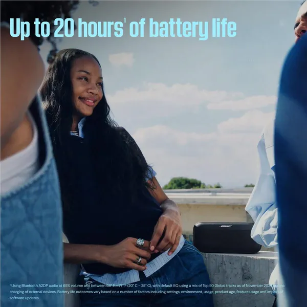 2 Using Bluetooth A2DP audio at 65% volume and between 20°C – 25°C, with default EQ using a mix of Top 50 Global tracks as of November 2024 and no charging of external devices. Battery life outcomes vary based on a number of factors including settings, environment, usage, product age, feature usage and impact of software updates.