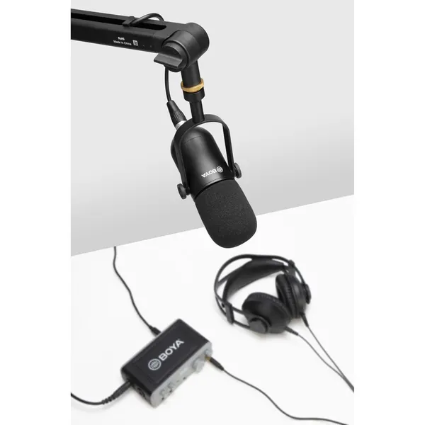 The Boya BY-DM500 is a podcasting and vocal microphone with a dynamic, cardioid mic capsule, adjustable mounting bracket, and a standard 3-pin XLR connector for compatibility with a wide variety of audio gear. The dynamic capsule makes it well suited for use as an up-close microphone when recording vocals and instruments using a preamp, audio interface, or mixer. The cardioid polar pattern also helps to focus audio capture on sources directly in front of the mic, picking up less background sound and unwanted noise, which is especially helpful in home and project studios.