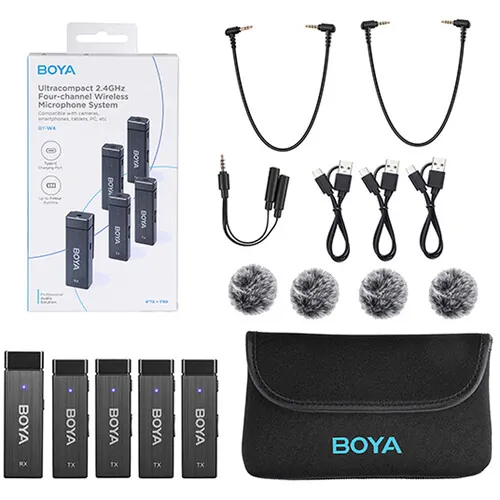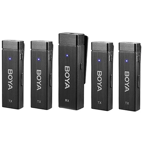 Record two-person or four-person vlogs and interviews to your DSLR/mirrorless camera or compatible smartphone using the BOYA BY-W4 Ultracompact 4-Person Wireless Microphone System and its four included transmitters with built-in omnidirectional microphones. The system not only includes these four transmitters with ultracompact form factor and back clips for attaching to your talent's lapel, but it also includes a four-channel receiver with 3.5MM TRRS connectivity. All of the components can communicate from up to 98' away via 2.4 GHz frequency.