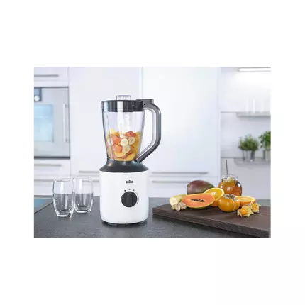 Specifications: Brand: Braun Chopping ice: Yes Grinding coffee beans: Yes Pulse mode: Yes Control type: Electronic Turbo Mode: Yes Immersion part material: Stainless steel Power consumption, W: 800 Blender type: Stationary Features TriAction Technology Blend all kinds of food. Thanks to the specially designed triangular-shaped jug, blind spots are avoided and the ingredients are redirected faster to the blending area. SmoothCrush blade system The higher blade positioning enables efficient blending circulation, creating perfect flow for optimum blending results. Powerful 800 Watt motor Enjoy the power you need to mix, puree, crush ice, and more. The highly efficient 800 Watt motor makes preparing your favourite food and beverages fast and easy.