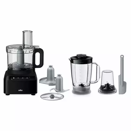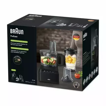 Power 800Watts Bowl Capacity 2.1 Litres And Blender 1.2 Litres 2 Speeds + Pulse Dough/kneading tool and whipping/ blending included Multi Mill And Spatula Included Features 800W Powerful Motor With the 800W powerful motor Braun Food Processor offer more work done in less time. Whether you're chopping, whisking, or blending this food processor can handle it all with ease. 2 speeds + Pulse Easy-to-use. Fast, slow, pulse, and stop give you rapid access to you making many types of recipes and ensuring your a master of your kitchen. Simply One Touch Enjoy simple processing at the touch of a button. The one touch pulse and speed controls make food prep fast and intuitive. 2.1L Bowl Capacity Enjoy plenty of volume for your everyday tasks with a total bowl capacity of 2.1 litre usable capacity for liquids. Braun PureEase Food Processor FP 3132 BK One touch is all it takes. With the new PurEase Food processor, you can enjoy simple processing at the touch of a botton. Discover how easy it can be to satisfy any food preparation desire with one easy-to-use appliance. To make food preparation fast and intuitive. Now you can chop, slice, grate, purée and knead at the touch of a button.