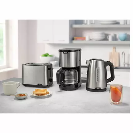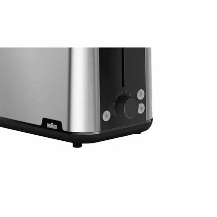 Brighten up your morning – with the all-new PurShine breakfast collection. You’ll love this easy-to-use and stylish product range that helps you make your breakfast quick and tasty. Make your favourite golden toast just how you like it, with the two-slot toaster that features 8 browning settings as well as a defrost and reheat function. Additionally, it comes with an integrated warming rack to conveniently warm up buns. Features 8 Browning settings With 8 different settings you can choose your preferred degree of browning, no matter what type of bread. Bread high-lift Easily remove even small slices of bread thanks to Braun high-lift system. Bun warmer Integrated bun warmer to conveniently warm up buns and other kinds of bread. Reheat+ and Defrost+ Gives you more control about the desired browning level when reheating or defrosting bread and toast. Auto-centering system Makes sure your bread is always in the ideal position, for even browning results. Intelligent heat control Enjoy consistent browning results over multiple toasting cycles, thanks to Braun intelligent heat control system. 4-way protection Anti-jam safety system, cool walls safe to touch, auto-shut off and extra stability granted up to 10° inclination. Features Defrost: Yes Cancel: Yes Safety / protection: 4-way Browning settings: 8 Reheat: Yes Removable crumb tray: Yes Control panel location: Side Intelligent heat control: Yes Comfort lift: No Bread auto centering system: Yes BPA free food contact parts: Yes Colour: Stainless steel/ black Housing: Stainless Steel / Plastic Slot size: 3.5x13.2x11.9cm Integrated power cord storage: Yes Slot type: 2-slot Wattage (W): 900
