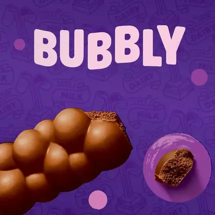 Our quirky Bubbly bar is the glorious result of infusing creamy Cadbury Dairy Milk with yummy bubbles; inside and out.