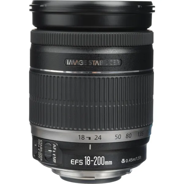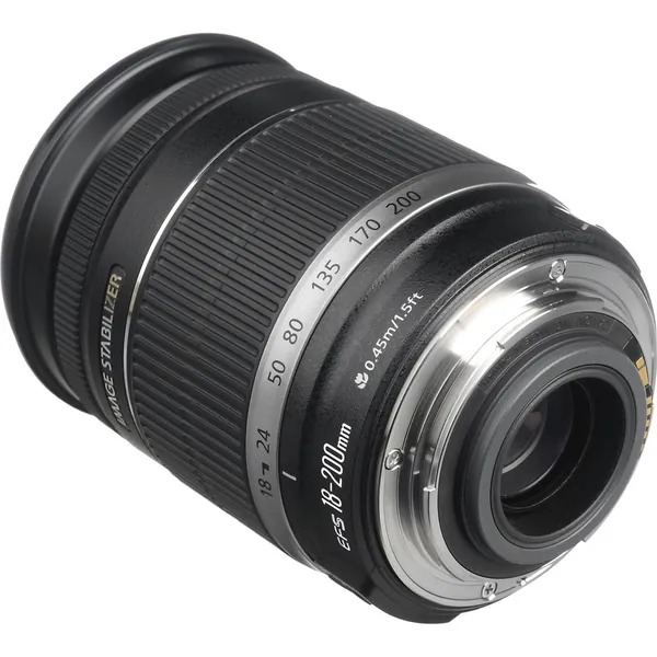 An ideal all-around lens, the EF-S 18-200mm f/3.5-5.6 IS from Canon is a 28.8-320mm equivalent zoom covering a versatile wide-angle to telephoto range. Using both aspherical and ultra-low dispersion elements, color fringing, chromatic aberrations, and spherical aberrations are well-controlled for a high degree of sharpness, color accuracy, and clarity. A Super Spectra coating has also been applied to suppress flare and ghosting for improved contrast. Complementing the imaging capabilities is a four-stop-effective Image Stabilizer system that minimizes the appearance of camera shake for sharper handheld shooting. Additionally, a DC Micro Motor autofocus system delivers quick focusing performance and a minimum focusing distance of 1.5' is available for close-up shooting.