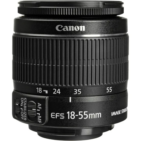 Provided in a white packaging box, the EF-S 18-55mm f/3.5-5.6 IS II from Canon is a standard zoom offering a 28.8-88mm equivalent focal length range. One aspherical element is featured in the lens design and helps to control spherical aberrations and distortion throughout the zoom range for consistent sharpness and clarity. A Super Spectra coating has also been applied to individual elements to control flare and ghosting for increased contrast and color accuracy in all lighting conditions. Complementing the imaging capabilities is a four-stop-effective Image Stabilizer system that minimizes the appearance of camera shake for sharper handheld shooting. Additionally, a Micro Motor autofocus system delivers quick focusing performance, and a minimum focusing distance of 9.8" is available at all focal lengths for close-up shooting.