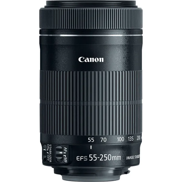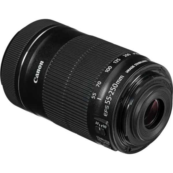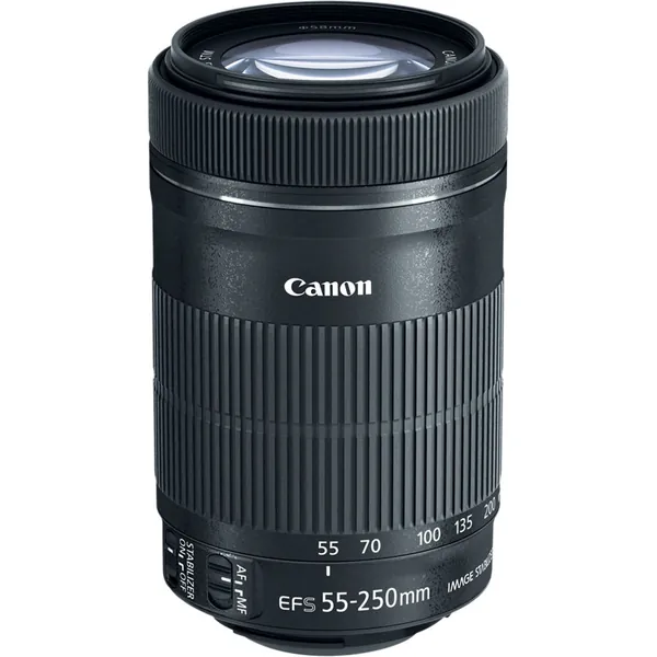 Suitable for distant subject matter, the EF-S 55-250mm f/4-5.6 IS STM is an 88-400mm-equivalent zoom for Canon APS-C DSLRs. This lens's long reach is enhanced by the inclusion of an Ultra-Low Dispersion element, which helps to greatly reduce color fringing and chromatic aberrations for greater clarity and color accuracy throughout the zoom range. A Super Spectra coating is also featured, and minimizes flare and ghosting in order to produce greater contrast when working in bright lighting conditions. Benefitting both photo and video applications, an STM stepping AF motor is used to realize quick and near-silent autofocus performance along with full-time manual focus override. Additionally, a four-stop-effective Image Stabilizer system is also featured and minimizes the appearance of camera shake for sharper handheld shooting.