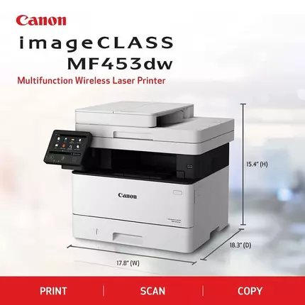 Canon ImageClass Monochrome Multifunction Printer WIreless 3in1 Print/Scan/Copy MF453dw Designed for small and medium-sized businesses, the Canon imageCLASS MF450 Series models balance speedy performance, minimal maintenance, and the ability to add an optional paper tray. A 5" color touchscreen delivers an intuitive user experience and can be customized by a device administrator to help simplify many daily tasks. The MF453dw has print, scan and copy functions, prints up to 40ppm and has a 3 year limited warranty. Application Library: Easy to Use, One Touch Solution Discover how easy it is to use Application Library on the MF450 Series. Customize your home-screen to access the functions you use the most. Finally, a printer that's programmable to meet your needs GENUINE Products. Maximum Results. Canon GENUINE ink and toner are engineered to achieve optimal performance with Canon printers. The exceptional design results in better operational success and end results, including higher yields, outstanding output and greater consistency, vibrancy, reliability and performance Canon's Automatic Replenishment Service Never run out of ink and toner again. Convenience and peace of mind. Specifications: Main Unit Core Functions: Print/Scan/Copy Item Code: 5161c011 Processor: Canon Custom Processor Control Panel: 5" Color Touch Panel Memory: 1 Gb Standard Interface Connection: Usb 2.0 High-Speed, 10/100/1000base-T Ethernet (Network), Wi-Fi 802.11b/G/N, Wi-Fi® Direct Connection Paper Capacity (Letter, 20 Lb. Bond) Standard: 350 Sheets Maximum: 900 Sheets Paper Sources (Letter, 20 Lb. Bond): Standard: 250-Sheet Paper Cassette, 100-Sheet Multipurpose Tray Optional: 550-Sheet Paper Cassette(Cassette Unit-Ah1) Supported Media Types Cassettes: Thin, Plain, Recycled, Thick, Bond Multipurpose Tray: Thin, Plain, Recycled, Thick, Bond,Label, Envelope (10 Envelopes) Supported Media Sizes: Cassettes: Letter, Legal, Statement, Executivecustom (Min. 4.1" X 5.8" To Max. 8.5" X 14") Multipurpose Tray: Letter, Legal, Statement, Executive Envelope: Com10, Monarch, C5, Dlcustom (Min. 3" X 5" To Max. 8.5" X 14") Supported Media Weights Cassettes: 16 Lb. Bond To 32 Lb. Bond (60 To 120 G/M2) Multipurpose Tray: 16 Lb. Bond To 43 Lb. Bond (60 To 163 G/M2) Warm-Up Time From Power On: 14 Seconds Or Less From Sleepmode: 4 Seconds Or Less Dimensions (W X D X H) Standard (Desktop): 17.8" X 18.3" X 15.4"(453 Mm X 464 Mm X 392 Mm) Standard (Desktop): 17.9" X 34.8" X 26.2" (453 Mm X 883 Mm X 664 Mm) Fully Configured: 17.9" X 34.8" X 31.3" (453 Mm X 883 Mm X 795 Mm) Installation Space (W X D X H) Weight 4: Unit: Approx. 35.7 Lb. (16.2 Kg), Boxed Weight :Approx. 46 Lb. (20.8 Kg) Operating System: Ufr Ii/Pcl/Ps: Windows® 8.1/10, Windows Server 2012 R2/2016/2019, Mac Os X V10.11 (Or Later) Print Specifications Printing Method: Laser Beam Printing Print Speed5: Up To 40 Ppm (Letter); Up To 32.4 Ppm (Legal) First Print Out Time: Approx. 5.4 Seconds Recommended Monthly Page Volume: 750 - 4,000 Pages Print Resolution (Dpi): 600 X 600 Dpi Standard Page Description Languages: Ufr Ii, Pcl®6, Pcl®5, Adobe Postscript 3® Double-Sided Printing: Automatic (Standard) Direct Print: Available From Usb Memory (Jpeg, Tiff, Pdf) Printing From Mobile And Cloud-Based Services3: Apple® Airprint®, Canon Print Business, Mopria™Print Service Fonts: Pcl: 45 Fonts, Ps: 136 Fonts Print Features: Secured Watermark, Header/Footer, Page Layout,Two-Sided Printing, Mixed Paper Sizes, Orientations,Toner Reduction, Poster Printing, Print Date, Collating, Grouping, Page Border,6 Booklet Printing6 Copy Specifications Copy Speed: 40 Ppm (Letter) First-Copy-Out-Time (Letter): Approximately 6.2 Seconds Copy Resolution: 600 X 600 Dpi Copy Size: Platen: Up To Letter, Adf: Up To Legal Multiple Copies: Up To 999 Copies Magnification: 25% - 400% (1% Increments) Preset Reductions: 25%, 50%, 64%, 78>#/Td### Preset Enlargements: 129%, 200%, 400>#/Td### Copy Features: Preset R/E Ratios By Area, Two-Sided, Density Adjustment, Original Type Selection, Two-Sided Original, Sort, N On 1, Different Size Originals, Sharpness, Erase Frame, Copy Id Card, Copy Passport, Paper Settings, Favorite Settings, Cancel, Collate Scan Specifications Type: Single-Pass Duplexing Automatic Document Feeder Document Feeder Paper Capacity: 50 Sheets (20 Lb. Bond) Document Feeder Supported Media Sizes: Legal, Letter, Statement Document Feeder Supported Media Weights: Single And Double-Sided Scanning: 13-28 Lb.Bond (50-105 G/M2) Platen Acceptable Originals: Sheet, Book Pull Scan: Scangear Mf For Twain, Wia, And Ica Scan Resolution: Up To 600 X 600 Scan To Mobile Devices: Canon Print Business Scan Speed (Letter): Single-Sided: 13/38 Ipm (300 X 300 Dpi) (Color/Bw), Double-Sided: 26/70 Ipm (300 X 300 Dpi) (Color/Bw) Memory Media: Standard Usb Memory (Jpeg, Tiff, Pdf) Send Specifications Destination: Email/Internet Fax (Smtp), Smb, Ftp, Super G3 Fax Address Book: Ldap (50)/Local (300)/Speed Dial (281) Send Resolution (Dpi): 300 X 300 Communication Protocol: File:Ftp, Smbemail/Ifax:Smtp, Pop3, Ifax (Simple) File Format: Standard:Tiff, Jpeg, Pdf (Compact, Searchable) Security Specifications Authentication: Standard:Department Id Authentication Data: Standard:Verify System At Startup Network: Standard:Ip/Mac Address Filtering, Ipsec, Tls Encrypted Communication, Snmp V3.0, Ieee 802.11b/G/N, Ipv6, Smtp Authentication, Pop Authentication Before Smtp Document: Standard:Secure Print, Searchable Pdf Wi-Fi Authentication Methods: Wi-Fi Infrastructure Mode: Wep 64/128 Bit, Wpa-Psk (Tkip/Aes), Wpa2-Psk (Aes), Wi-Fi Access Point: Wpa2-Psk (Aes) Environmental Specifications Operating Environment: Temperature: 50 To 86º F, Humidity: 20 To 80% Rh (No Condensation) Power Requirements: Ac 120-127 V:5.9 A, 60 Hz Power Consumption: Maximum: Approx. 1330 W, Standby: Approx. 10 W, Sleep Mode: Approx. 0.9 W, Typical Electricityconsumption (Tec) Rating: 0.34 Kwh Standards: Energy Star® Qualified, Currently Rated Epeat Silver2