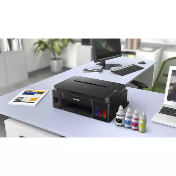 A compact, reliable, refillable multifunctional ideal for home or office, with high yield inks for productive low-cost printing. Compact high yield print, copy and scan Efficient and versatile, this home and office multi-functional printer boasts high yield ink bottles for low cost, high quality document and photo printing, copying and scanning and the reliability to handle high page volumes with ease. Incredible page yields Experience highly cost effective and productive printing with high yields* of up to 12000 pages from 2 black bottles or up to 7000 pages using a single set of colour bottles. High quality prints Print in high quality using Canon’s FINE technology and hybrid ink system with pigment black for sharp documents and dye-based colours for vivid borderless photos up to A4. Compact, reliable multifunctional This compact All-in-One with print, copy and scan handles large print volumes with ease thanks to its durable, FINE ink system. Ideal for home or small offices. Features: High Page Yield Integrated ink tanks Hybrid ink system Borderless printing Auto power On Sharp black text Rear paper feeding 1.2” LCD Technical Specifications: Functions Print, Copy, Scan Printer Specifications Print Resolution: Up to 48001 x 1200 dpi Print Technology:2 FINE Cartridges (Black and Colour)Refillable ink tank printer Mono Print Speed: Approx. 8.8 ipm2 Color Print Speed: Approx. 5.0 ipm3 Photo Print Speed: Borderless 10 x 15 cm: Approx. 60 seconds4 Borderless Printing:Yes (A4, Letter, 20 x 25 cm, 13 x 18 cm, 13 x 13 cm, 10 x 15 cm) Cartridges And Yields Standard Ink Cartridges: GI-490