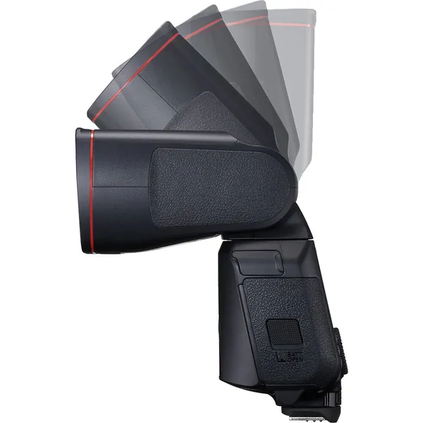 The flash has a rugged physical design equivalent to the dust and water-resistance of the EOS-1D-series camera bodies. Its improved user interface incorporates an updated joystick design, display, and control layout, and it features a tunable LED modeling lamp to help previsualize the lighting. Additionally, the flash head can fully swivel 180° left and right and includes a built-in wide panel.