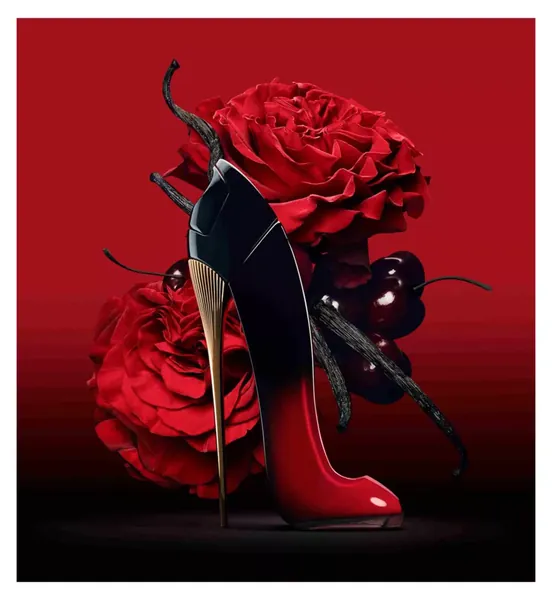 Very Good Girl Elixir reaches new heights of seduction with a red-to-black gradient stiletto contrasted with a glimmering gold heel.