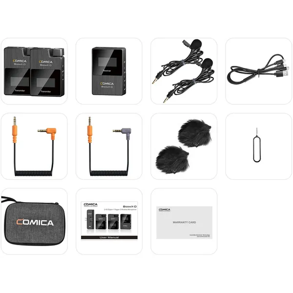 The ultralightweight BoomX-D D2 consists of two ultracompact clip-on transmitters each with its own built-in omnidirectional microphone and a separate lavalier microphone. It also comes with a tiny receiver that mounts on and plugs into your camera with the included TRS cable. An additional TRRS output cable gives you the option to plug the receiver into any smartphone equipped with a headphone jack.
