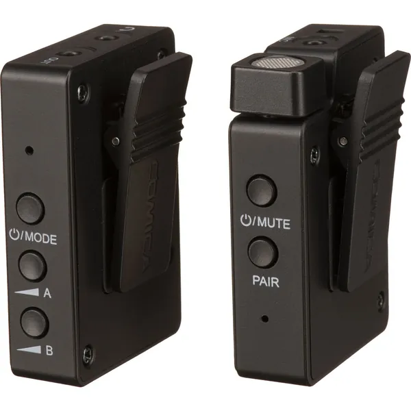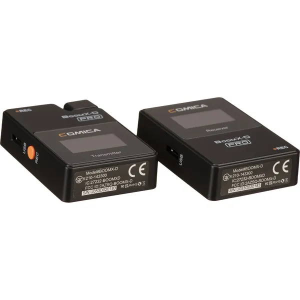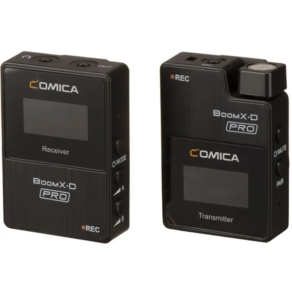 Designed for mobile journalists, videographers, and vloggers, the black Comica BoomX-D PRO D1 is an ultracompact, true wireless digital microphone system with one transmitter microphone and a dual-channel receiver. It offers a complete solution for recording dialogue, interviews, and speech with a single person—directly to a mirrorless/DSLR camera, mobile device, or computer with backup audio recording available on the transmitter.