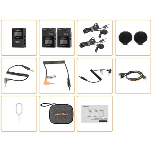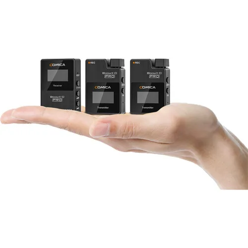 Designed for mobile journalists, videographers, and vloggers, the black Comica BoomX-D PRO D2 is an ultracompact, true wireless digital microphone system with two microphones and just one receiver. It offers a complete solution for recording dialogue, interviews, and speech with two people talking simultaneously—directly to a mirrorless/DSLR camera, mobile device, or computer with backup audio recording available on each transmitter.