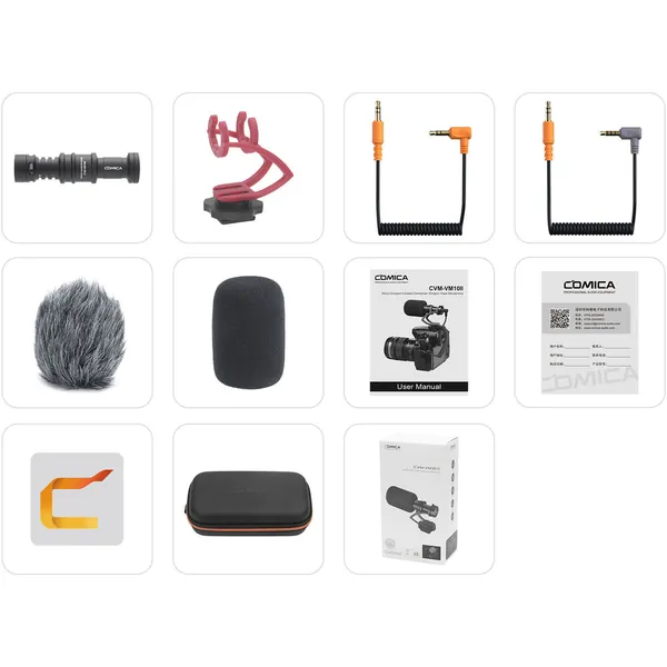 The CVM-VM10 II microphone features a super anti-interference function installed within the internal microphone. It is powered by the video device and includes a professional shockmount, foam windscreen, and a wind muff to attenuate wind noise when using it outdoors. A 3.5mm TRRS smartphone audio cable, and a 3.5mm TRS camera audio cable are also included.