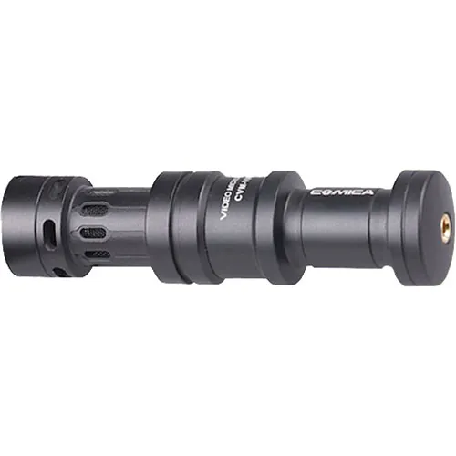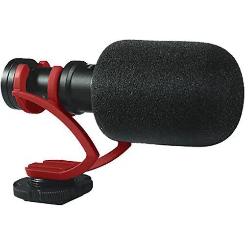 The red shockmount CVM-VM10 II Micro Compact Directional Condenser Microphone from Comica Audio is a lightweight, all aluminum microphone with a supercardioid polar pattern designed for use with DSLRs, smartphones, and camcorders. It can be used to capture audio for professional video recordings and broadcast TV applications.