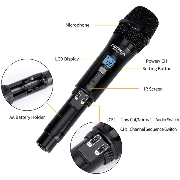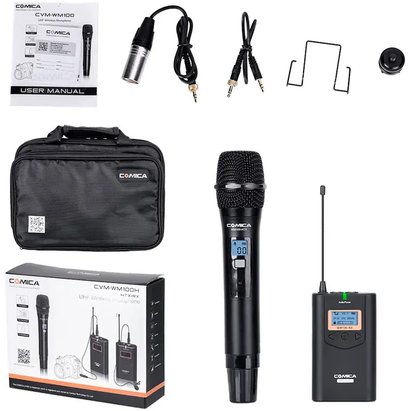 The CVM-WM100H comes with a handheld microphone, a camera-mount receiver, multiple cables, mounting accessories, and a carry case, ensuring you have everything you need for seamless audio integration into your video production setup.